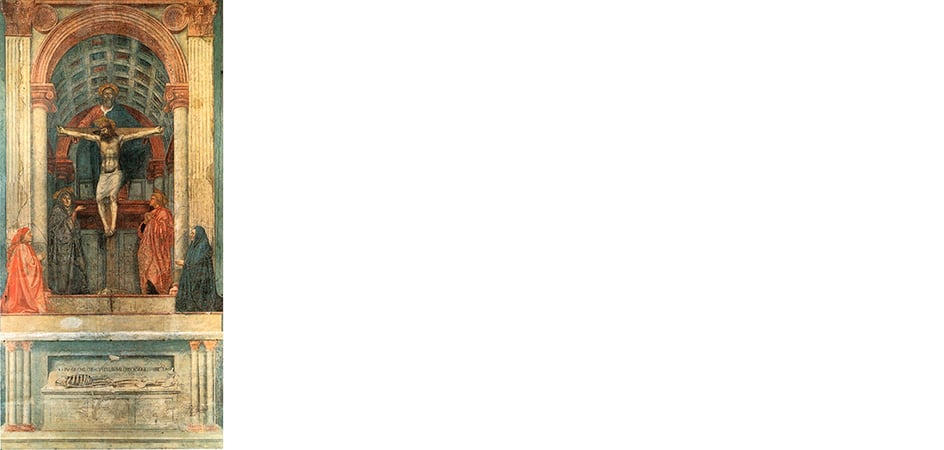 He is also credited with inventing linear perspective, first applied by Masaccio in the fresco of the Trinità in Santa Maria Novella. What struck viewers who saw it for the first time – used as they were to the elegant but static representations typical of the Gothic – was the optical illusion created by the space behind Christ. A background no longer flat but realistic, with a foreshortened barrel vault that seems to extend deeply behind the group. A pictorial revolution that had enormous success. Masaccio also adds a new physicality to the figures: no longer graceful and uniform, but full and massive, with the gesture of the Virgin indicating the Son confirming their verisimilitude.